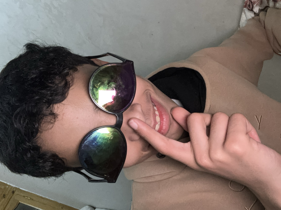 - "A person with curly dark hair and dark skin is wearing oversized sunglasses with iridescent lenses" by FM-wL3YJ2, licensed under CC BY 4.0