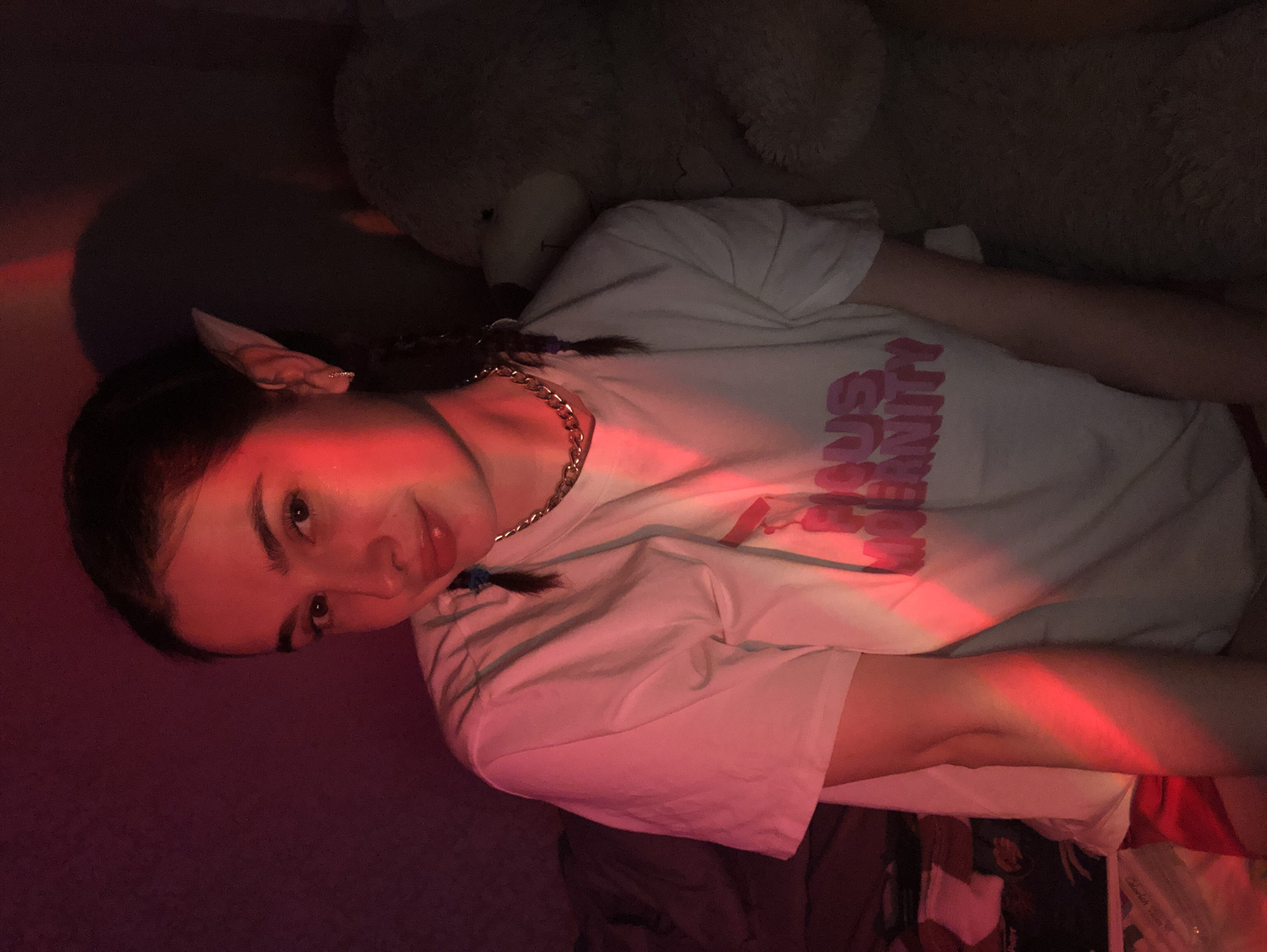 - "A young adult woman with pointed ears is lying down indoors with a large teddy bear" by FM-cZ4iW2, licensed under CC BY 4.0