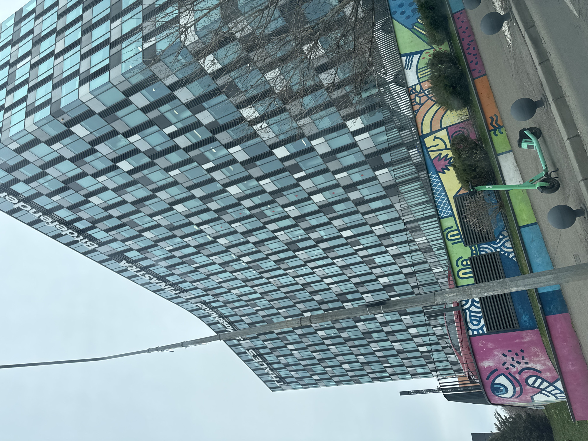 An outdoor, daytime image depicts the Globalworth Plaza office building located at Strada Gara Herăstrău 4C, Bucharest, Romania. The multi-story structure features a curved, modern facade composed of alternating light blue-green and dark grey glass panels arranged in a grid pattern. Company logos for "Bitdefender," "FINASTRA," "MassMutual," and "THALES" are affixed to the upper portions of the building. In the mid-ground, a multilayered retaining wall parallels the building. Its upper section is adorned with a multicolored, abstract mural featuring geometric patterns, waves, and a stylized eye and mouth design, utilizing shades of pink, blue, green, yellow, and orange. Dark rectangular vents are integrated into the wall. A dark metal railing runs along the top of this wall, behind which a reddish-brown car is partially visible. A bare-branched tree stands in front of the building on the right side. The foreground contains a grey street pole positioned centrally, extending from the bottom to the top of the frame. A paved sidewalk runs horizontally, flanked by several dark grey spherical bollards. A green "Bolt" brand electric scooter is parked upright on its kickstand on the sidewalk between two bollards. To the left and below the retaining wall, patches of green grass and small bushes are visible. A dark asphalt street is visible in the bottom right corner. The sky is uniformly overcast and light grey. No individuals are visible.