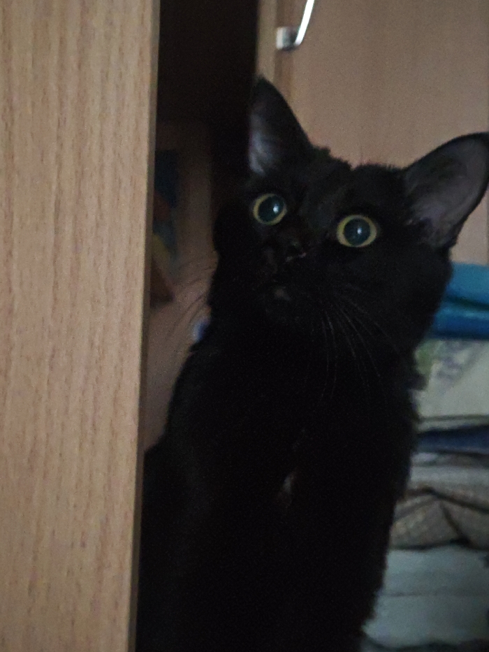 - "This image captures a black domestic cat peering from behind a light-colored wooden vertical surface in an indoor setting in Chaikovsky, Russia" by FM-hxFsK2, licensed under CC BY 4.0