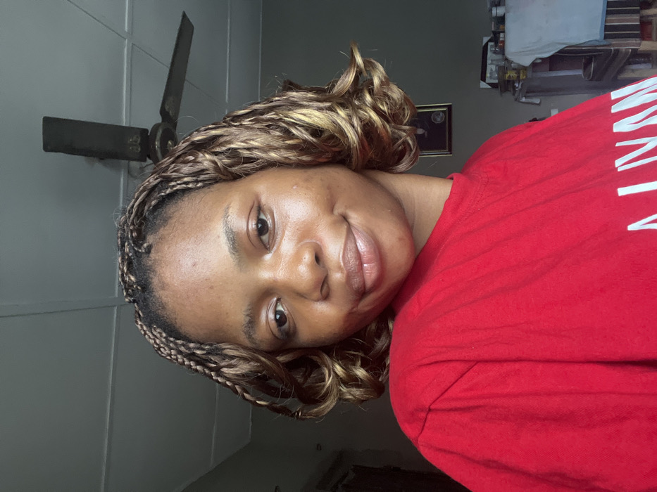 The image captures a female individual in an interior room located in Lagos, Nigeria. She has a medium-dark skin tone, with braided hair featuring light brown and blonde sections, styled to shoulder-length. She is wearing a solid red short-sleeved garment and is depicted looking directly at the camera with a slight, closed-mouth smile. Overhead, the ceiling is paneled and light-colored. A dark, three-bladed ceiling fan, exhibiting signs of wear and dust accumulation, is mounted on the ceiling above and to the right of the subject's head. To the right of the subject, a wall of indeterminate light color features a dark-framed picture. Below the picture, the upper part of a wooden storage unit is visible, holding multiple miscellaneous objects, some of which are partially obscured by a white textile.