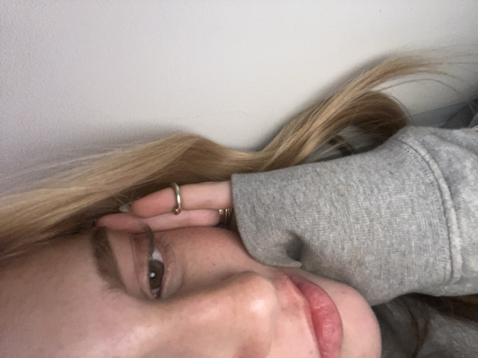 A close-up portrait shows the left side of a fair-skinned individual's face, with light brown or blonde hair partially framing it. The visible eye is brown, and the lips are light pink. The individual's head rests on their left hand, which is covered by the sleeve of a gray hooded sweatshirt. Two rings are visible on the left index finger: a thicker gold-toned band and a thinner, stacked band below it. The background is a plain, light-colored wall. The scene is located in Pudong, China.