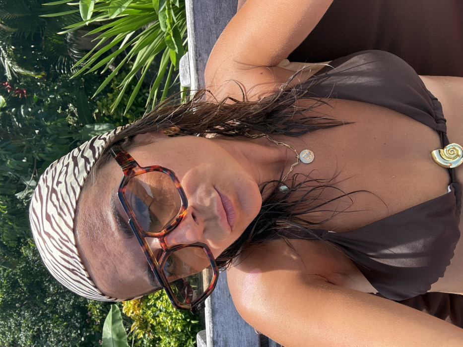 A tanned woman poses outdoors, donning a brown bikini with a golden seashell detail. Zebra-striped headscarf complements her wet, dark hair. Tortoiseshell sunglasses rest on her face, offering a glimpse of greenery reflected in the lenses. A delicate gold chain necklace with a circular pendant adorns her neck. The image is tilted, capturing a sun-kissed and relaxed ambiance.