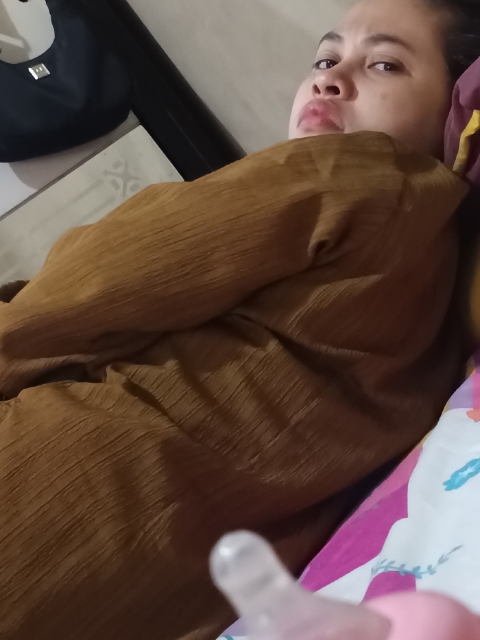 A woman lies in bed, eyes slightly open, lips pursed. She is covered in a brown, textured fabric. A black bag sits on a table near her head. A baby bottle with a pink cap is in the foreground, partially out of focus. The bed has white sheets with a pink and blue pattern.