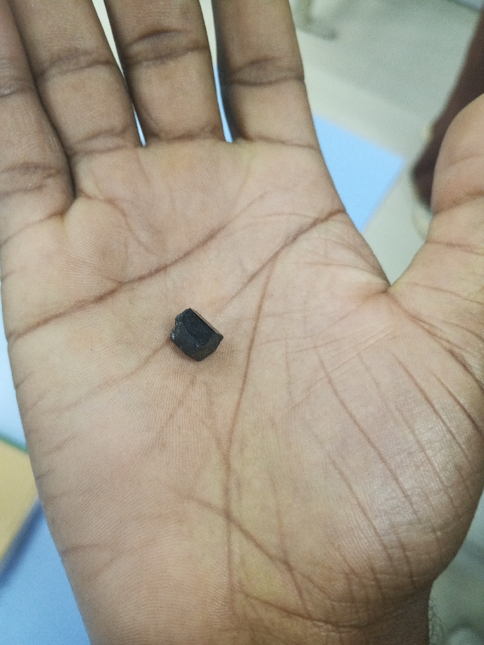 A dark-skinned hand holds a small, angular black object in its palm. The object appears to be a fragment of a larger item, possibly made of plastic or a similar material. The hand is open, revealing the palm lines and texture of the skin. The background is blurred, suggesting an indoor setting with hints of a blue surface and a person partially visible. The focus is sharp on the hand and the small object.