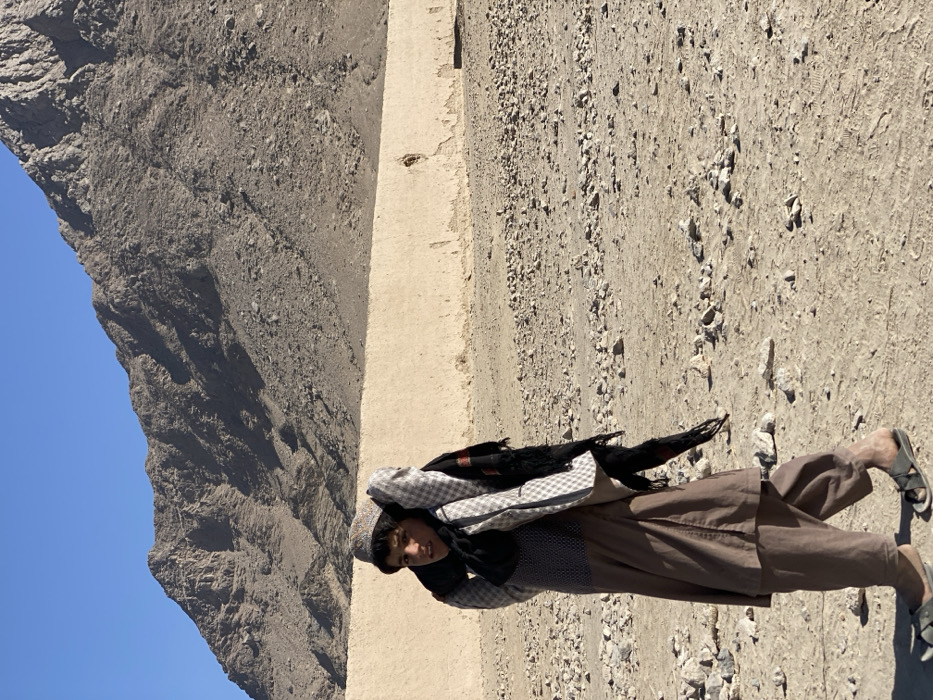 A young male individual is depicted standing on a rocky dirt path in an arid, mountainous landscape under a clear blue sky. He wears a light-colored patterned skullcap, a dark patterned top, brown loose-fitting trousers, and dark sandals. A bundle of textiles, including a black scarf and a light checkered fabric, is carried over his left shoulder, draped across his back. His face is turned towards the viewer with a neutral expression. In the midground, a weathered, light-colored wall, possibly constructed from mud or concrete, extends horizontally across the scene, exhibiting signs of wear and a small hole. Beyond the wall, a large, barren mountain range with rocky slopes dominates the background. The ground is covered with dirt and numerous small and medium-sized rocks. The scene is located in Unknown, Unknown, under bright daylight.