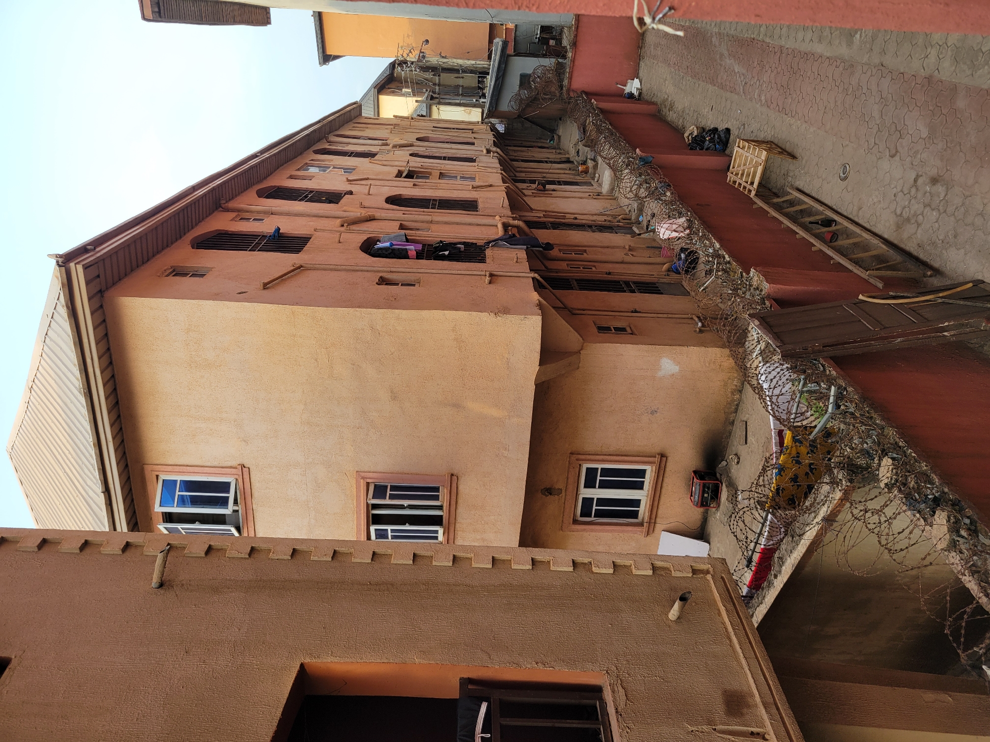 The image depicts an urban residential scene in São Félix do Xingu, Brazil, characterized by closely packed multi-story buildings and a narrow passageway. The primary structure on the right is a multi-story building, likely residential, with a light peach-colored textured facade and a corrugated metal roof. Its exterior features multiple windows, some rectangular with white frames, others with arched tops and fitted with dark metal security bars. Laundry, including shirts and other garments, hangs from several windows and balconies on the upper and middle floors. Exposed utility pipes run vertically along its facade. To the left, a portion of another building with a darker, reddish-brown textured facade is visible. This building exhibits a distinct stepped, decorative vertical trim. A single open window with dark security bars and a dark interior is present, along with a wooden pipe-like protrusion extending horizontally from its wall. Separating the main building from a paved alleyway or courtyard is a rust-red painted wall, topped with multiple strands of rusty barbed wire. Debris and various items are entangled within the barbed wire. Behind this wall, on a lower level courtyard, a red portable generator is visible, along with a white panel leaning against the wall and draped fabrics, one red and one yellow-patterned, possibly laundry. The paved alleyway features interlocking concrete pavers. A wooden ladder lies flat on the ground, and an upright wooden crate or pallet structure is present. Black bags, resembling refuse, are stacked against the wall. In the background, partially visible between the main buildings, are more structures, some with visible corrugated metal roofs and external wiring. The sky above is a pale, uniform grey, indicating an overcast day. No individuals are visible in the scene.