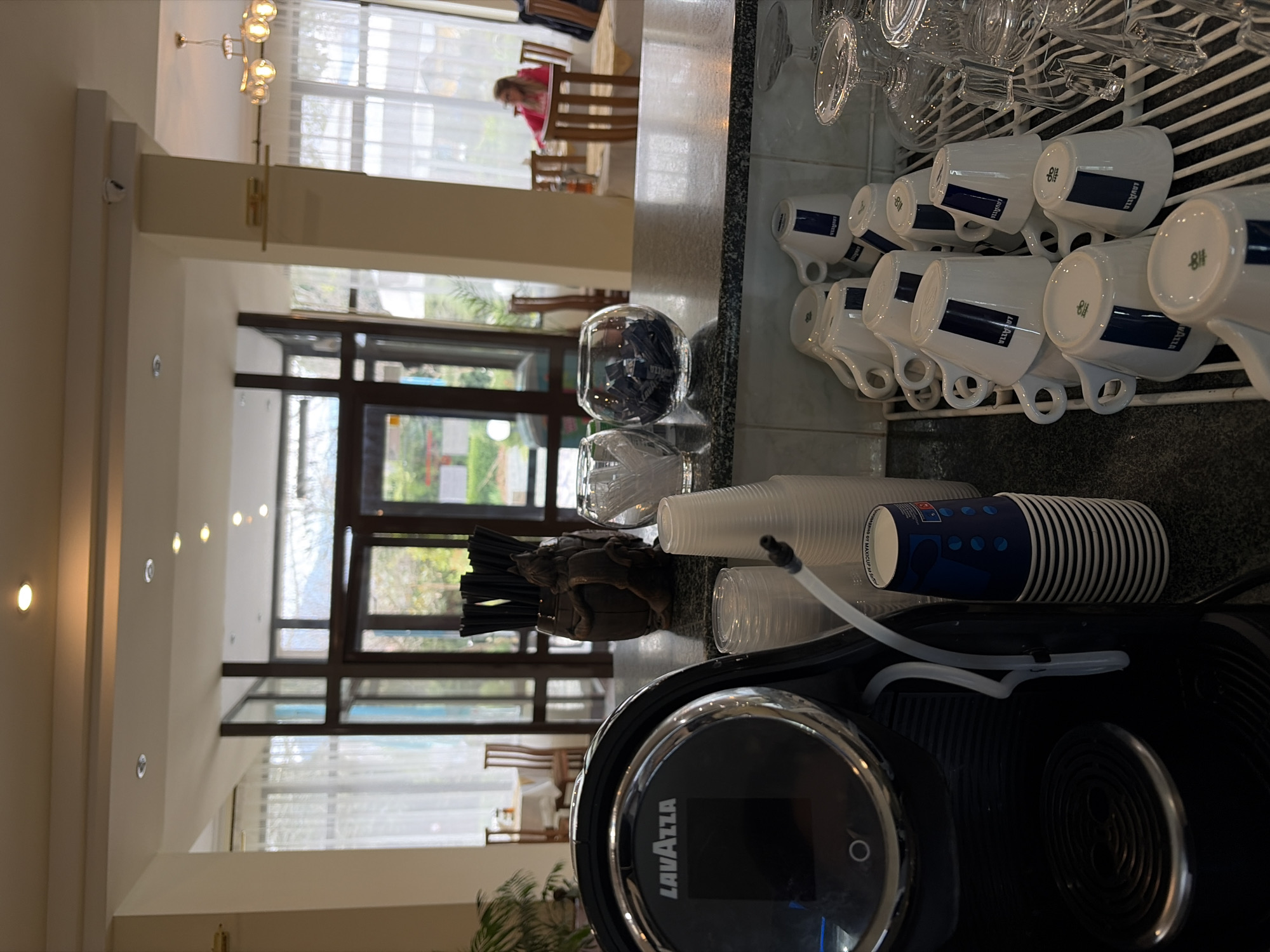 breakfast area in a hotel or resort, possibly in Dolna Banya, Bulgaria, based on the prompt. A Lavazza coffee machine is in the foreground with cups and sugar in a glass bowl, and stir sticks. On a counter behind the coffee maker are white Lavazza-branded cups on a rack. In the background, tables and chairs suggest a dining area, with at least one person seated at a table near a large window. The setting appears to be a bright, airy space.