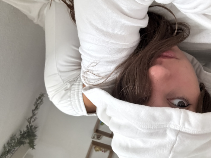 An indoor scene features a female subject in a prone or semi-prone position. The specific location within Valencia, Spain, cannot be determined from the visual evidence, as the environment consists of generic white walls and minimalist decor. The subject, appearing to be a young adult with long brown hair, is wearing a white hooded sweatshirt with the hood pulled over her head, partially obscuring her face. She also wears matching white athletic-style trousers, the elasticized waistband of which is visible on her lower back. Her right eye is in direct focus, making eye contact with the camera, while her left eye and the left side of her face are largely obscured by her hair. Her head is tilted, resting on her arm or the surface beneath her, which is also white. In the background to the upper left, a light-colored wooden shelving unit with small, indistinct items is visible. To the upper right, a green, leafy plant or artificial vine is affixed to the white wall. No other individuals or discernible interactions are present.