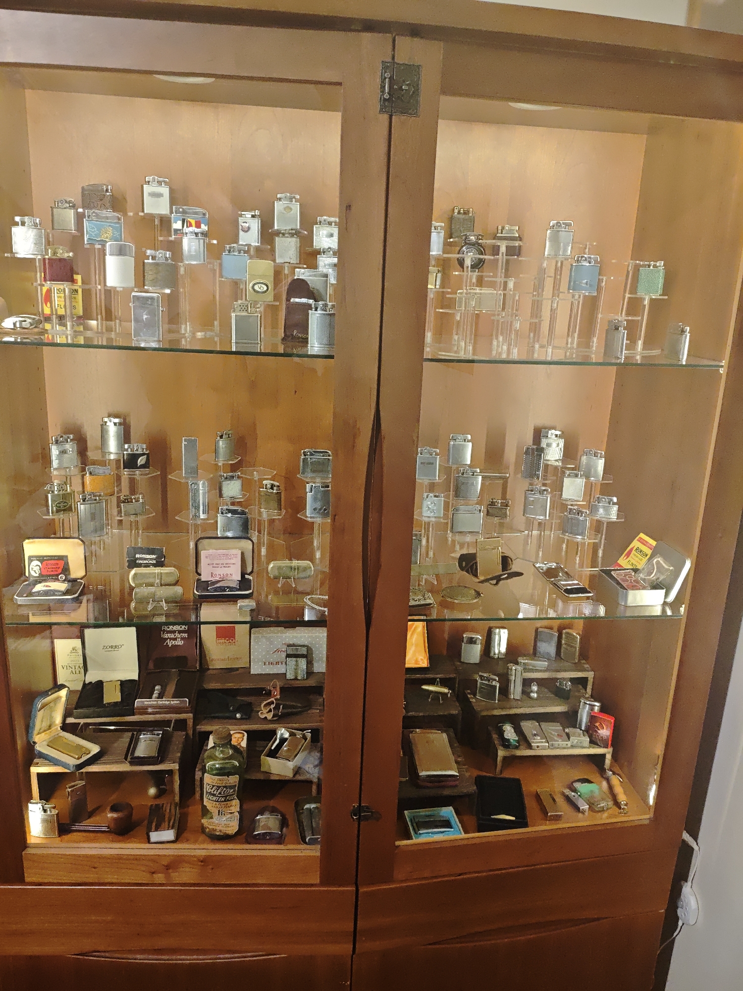 - "This image depicts an indoor scene in Swindon, United Kingdom, focusing on a tall, wooden display cabinet filled with a collection of vintage lighters and smoking accessories" by FM-5h6EL2, licensed under CC BY 4.0