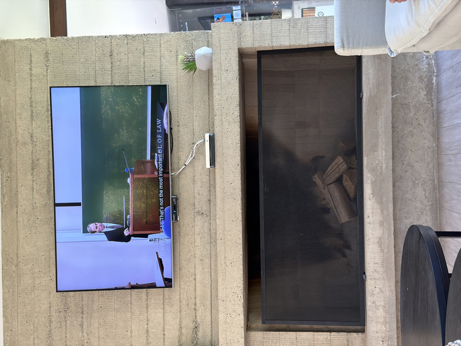 A television shows a person speaking at a podium, a screen reads "That's not the most important dL OF LAW". The TV is mounted to a textured concrete wall, along with a small white object with greenery and a black device. To the right is a fireplace with a black mesh screen and wood inside. In the lower right corner are two black side tables.
