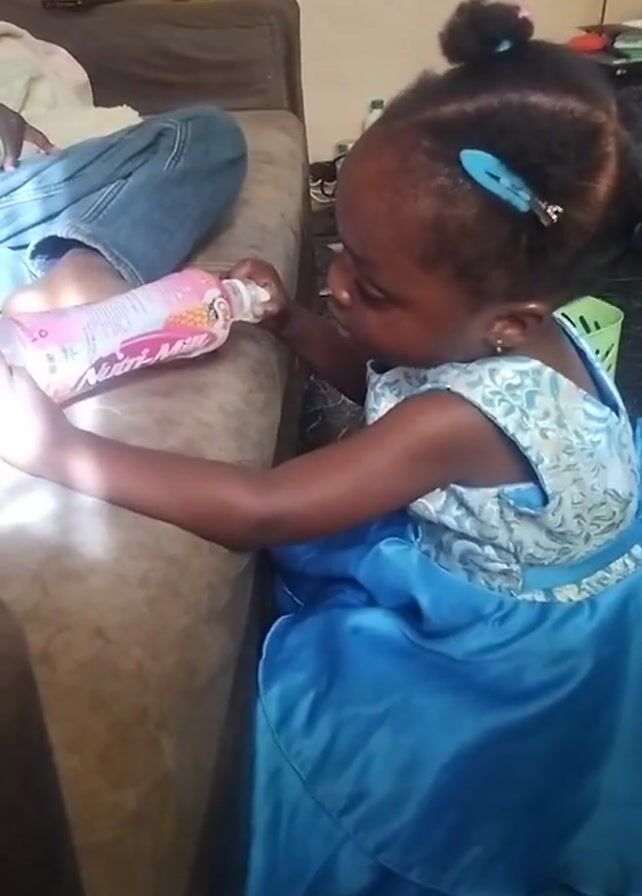 A little girl wearing a blue princess dress and hair clips is attempting to open a bottle of pink lotion while sitting next to someone on a couch. The person is wearing blue jeans and a white shirt. The lotion bottle is pink and white with cartoon images. The room has a brown couch, a yellow object on a side table, and a green basket on the floor. The sunlight is coming in through a window.