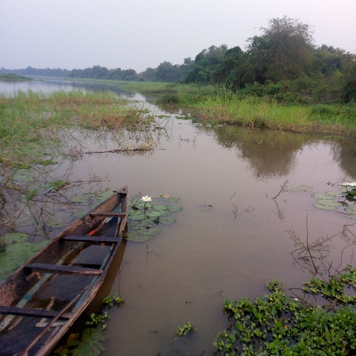 A tranquil wetland scene features a wooden canoe docked near lily pads with blooming white water lilies. The water reflects the sky, tinged with the colors of dawn or dusk. Lush green vegetation lines the water's edge, blending into a dense forest in the background. The atmosphere is calm, suggesting a quiet, natural setting.
