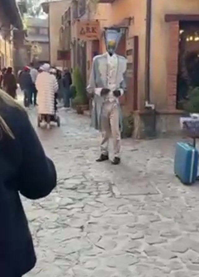 paved street with a performer standing still in a blue and white costume, including a headpiece that resembles a glass container with a yellow object inside. The performer is wearing black gloves and formal shoes. Behind the performer, there are buildings that resemble European architecture with balconies and a sign that says "THE ARK". People are walking in the background. There is a suitcase and a small stand next to the performer. The day appears to be bright and sunny. The video is shot from a slightly low angle.
