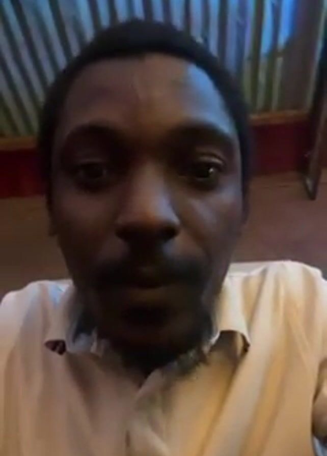 A man is centered in the frame, gazing directly into the camera. He has dark hair, a mustache, and a bit of stubble on his chin. He’s wearing a white collared shirt. Behind him, the wall is a combination of red on the bottom, with blue and white corrugated metal lining the top. Music can be heard.