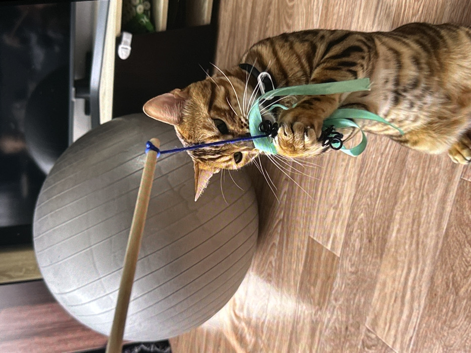 A tan and brown tabby cat is sprawled on a light wood floor, engrossed in play. It's gripping a blue ribbon-like toy, which is connected to a wooden stick that rests against a large, gray exercise ball. The cat's intense gaze is fixed on the toy, its claws extended, showcasing a playful energy. A black shelf with items on top is visible in the background.