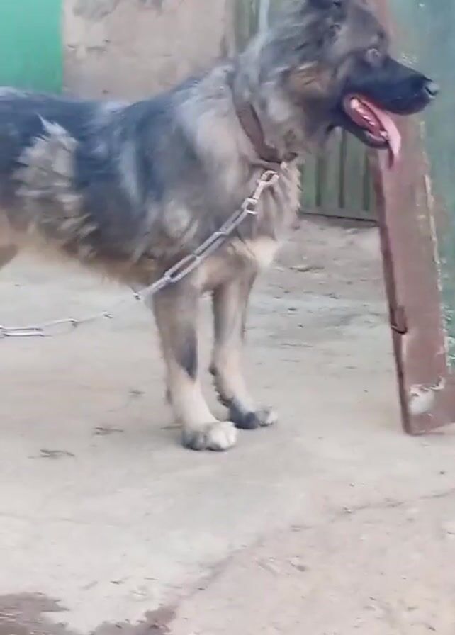 Here's a detailed description of the video: The video shows a medium-sized, long-haired dog standing on a concrete surface. The dog has a grey, black, and tan coat and is wearing a brown collar with a silver chain leash attached. The leash appears to be secured to something off-screen. The dog's tongue is hanging out of its mouth. The dog shakes its head once. The background includes a weathered, green-painted wall, a rusty piece of metal leaning against the wall, and a concrete structure. The scene appears to be in an outdoor, possibly backyard, setting.