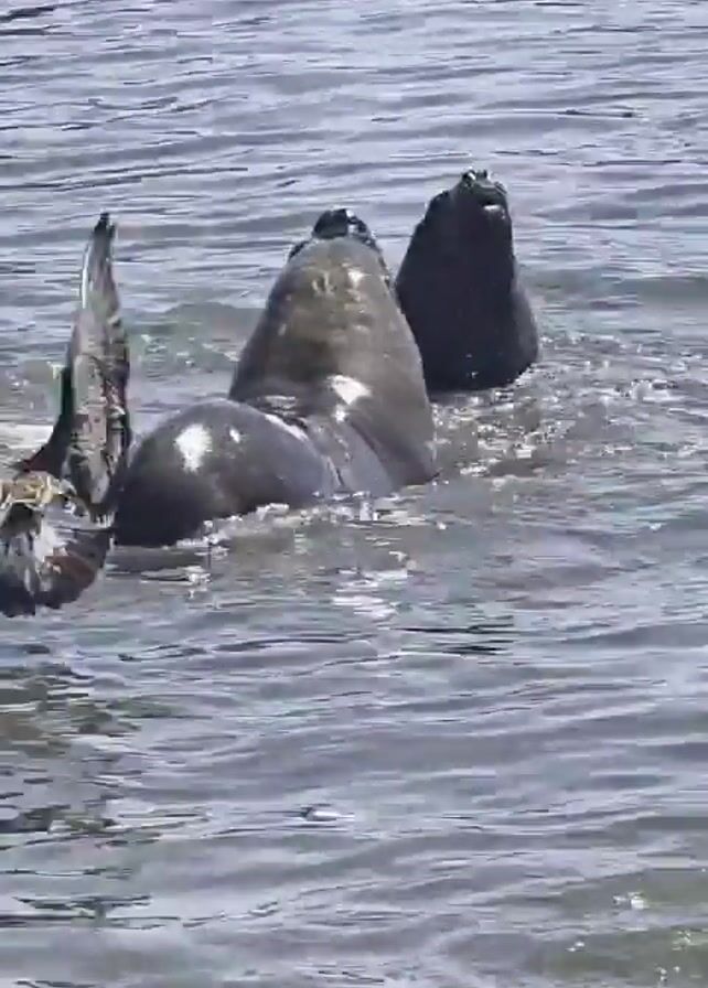 In a daytime shot, the water is relatively calm and several sea lions are visible swimming. One sea lion appears to be climbing on top of another, while a bird flies close to the group. The sea lions are dark in color and their bodies are wet and shiny. The bird has a large wingspan and appears to be a seagull, flying low to the water and the sea lions.