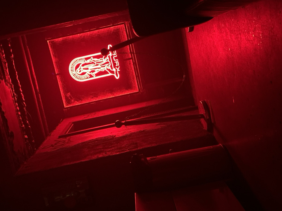The image displays the interior of an establishment, heavily illuminated by deep red lighting, characteristic of a bar or nightclub