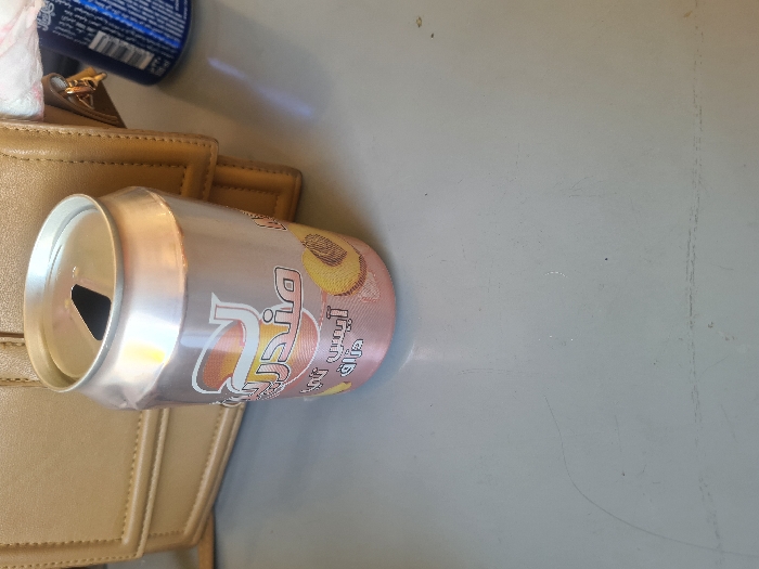 - "The image displays an open, light peach-colored aluminum beverage can with a silver top, positioned on a light gray, slightly scratched surface" by FM-9VsWL2, licensed under CC BY 4.0
