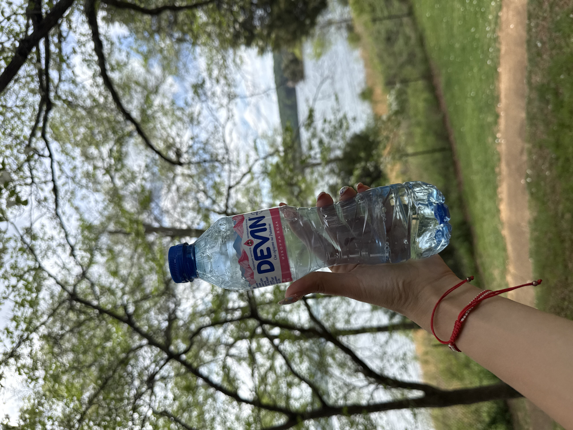 A hand holds a bottle of Devin brand water against an outdoor background. The hand is fair-skinned and has a red string bracelet on the wrist. The bottle is partially full, and the Devin label is visible. The background includes trees with green leaves, a body of water (likely a lake or river), a grassy area, and a dirt path. The scene is outdoors and appears to be a natural environment, possibly a park or a scenic area. The location cannot be determined from this image alone to be Jasper, United States.