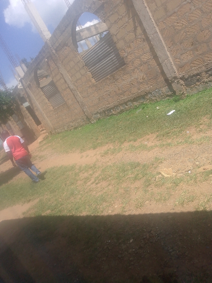 This image depicts an outdoor scene in Kakamega, Kenya. A multi-story building, appearing to be under construction or renovation, dominates the right and central portions of the frame. The building's walls are composed of textured, light brown blocks with exposed concrete columns and rebar protruding from the top, indicating an unfinished state. Several window openings, some arched and others rectangular, are present; some are covered with corrugated metal sheets. The ground in the foreground and midground consists of a reddish-brown dirt path interspersed with patches of green grass. A small piece of white debris is visible on the grass in the midground. A single individual is observed on the left side of the frame, walking away from the camera towards the building. The person wears a red shirt with white sleeves or shoulder accents, blue jeans, and light-colored shoes. The sky in the upper left background is blue with scattered white clouds. A large, dark shadow partially obscures the bottom section of the image.
