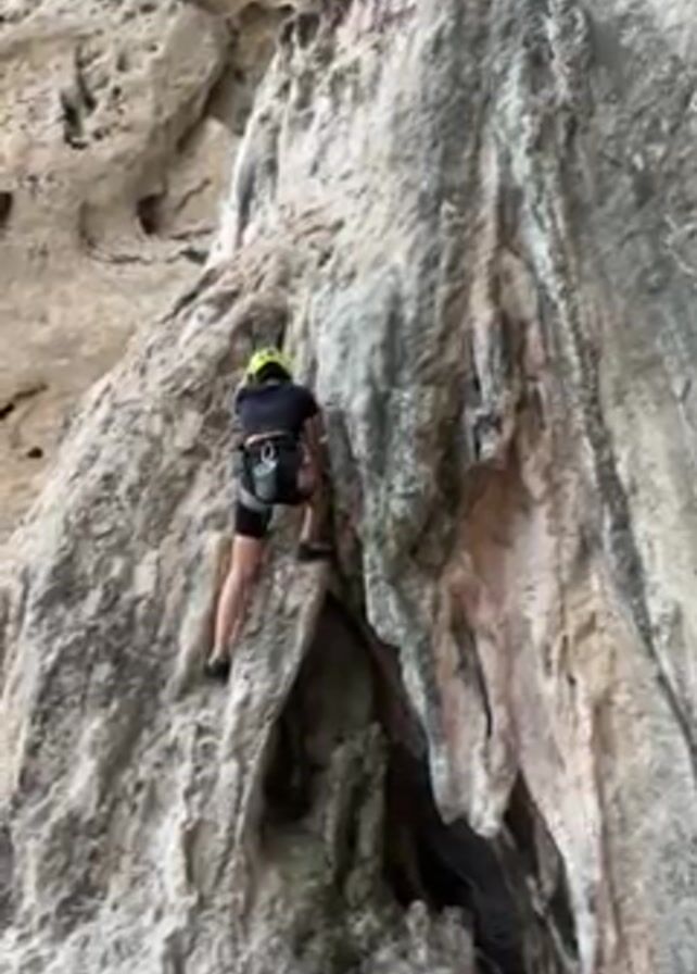 A person is rock climbing up a tall, grey cliff. The climber is wearing a black shirt and black shorts, a yellow helmet, and a climbing harness. The cliff face is textured with various holes, ridges, and grooves. A climbing rope is visible extending upwards from the climber, and vegetation grows at the base of the cliff.