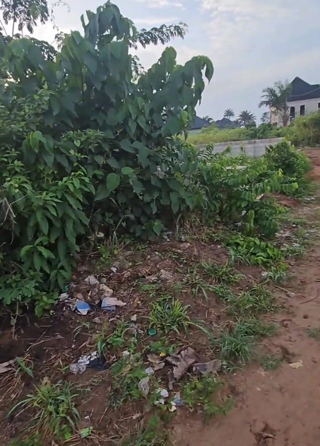 dirt road in a residential area. The road is littered with trash. There are trees and bushes on either side of the road. A few houses are visible in the background, one with solar panels and barbed wire on top of the wall. There is no indication of when the video was taken. There are no people or animals visible.