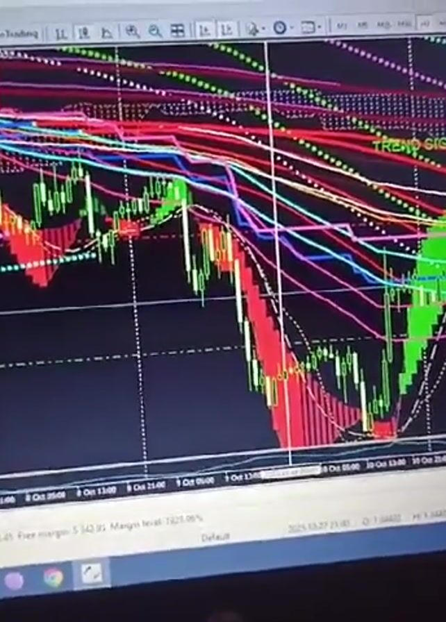 close-up of a computer screen displaying a forex trading platform. The chart shows a candlestick graph with multiple technical indicators, including trend lines and moving averages, making the chart look cluttered. At the top of the screen are "Sell" and "Buy" buttons with fluctuating numbers beside them, and "Total Open Trades: 8.00". The indicator on the chart reads "TREND SIGNAL: No Clear Identifiable Trend". On the left side of the screen is a list of currency pairs with real-time quotes. The bottom of the screen displays account information, including balance, equity, margin, and margin level. The computer screen reflects some ambient light. The date and time displayed in the bottom right corner are 2023/10/13 21:08:05.