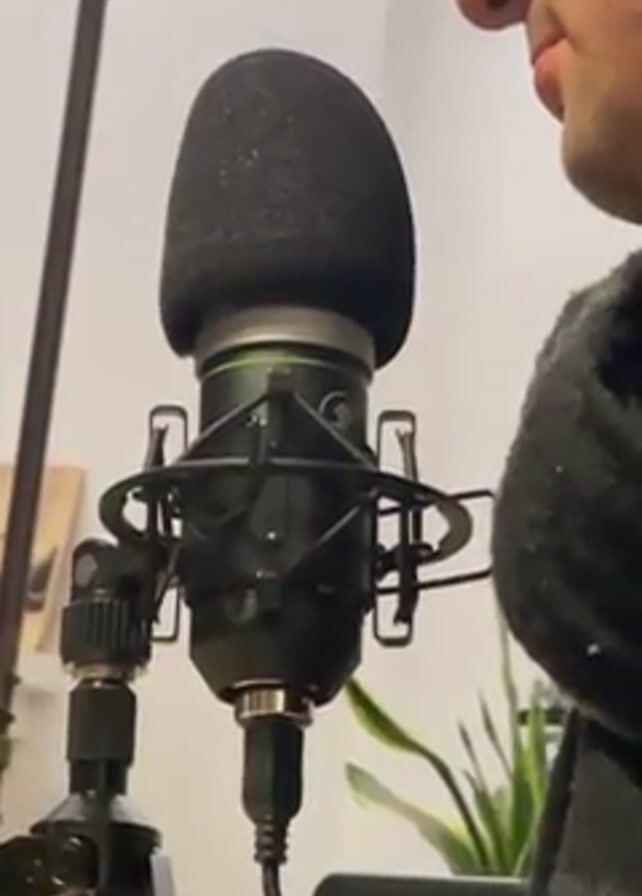 A close-up shot shows a man standing close to a microphone. The microphone is black and has a foam windscreen. It is mounted on a stand. The man appears to be singing or speaking into the microphone. His face is partially visible; we can see his nose and mouth. The background includes a floor lamp, a piece of artwork, and a potted plant.