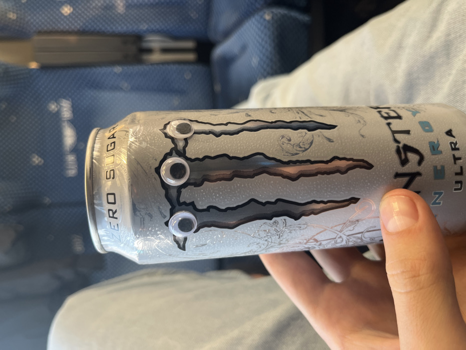 The scene is situated in Dunavtsi, Bulgaria, within the interior of a public transport vehicle. The central focus is a silver-colored Monster Energy Ultra Zero Sugar can, held by a human hand visible in the lower left. Three white googly eyes with black pupils are affixed to the can's front surface, positioned over the iconic Monster "M" claw mark logo. The can displays "ZERO SUGAR" near the top and partial "MONSTER ENERGY ULTRA" text towards the bottom. The background, out of focus, depicts patterned blue fabric seating and a dark vertical structural element, consistent with a train or bus interior. A segment of a person's leg, clad in light-colored fabric, is visible in the lower right foreground.