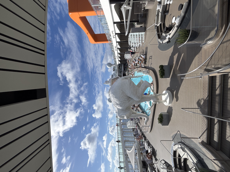 The image displays the outdoor upper deck of a modern cruise ship under a clear blue sky with scattered white clouds, suggesting a sunny day at sea. No specific land features of Long Island, Bahamas, are visible; the scene is confined to the vessel. A prominent, large, white, textured statue of an elephant, appearing to balance on its hind legs atop a smaller, white, quadrupedal creature, is centered on a circular base near an irregularly shaped swimming pool. The pool contains light blue water, and several individuals are present in or around it. Numerous people are observed on the deck: some are swimming or seated at the pool's edge, while others are relaxing or sunbathing on dark lounge chairs with white cushions arranged around the pool and along the deck. A curving, glass-paneled promenade or upper deck walkway is visible on the left, with several pedestrians walking along it. Architectural elements of the ship include a distinctive orange, curved structural piece on the right side of the frame, and various white superstructure components, such as radar domes and antennas, are visible in the background. The deck surface is a light brown composite material resembling planks. Additional contemporary outdoor seating areas, complete with curved sofas and small tables, are present on the lower right. Metal-railed staircases lead to lower deck sections, and several planters containing green foliage are strategically placed. The open ocean is visible beyond the ship's railings on the left.