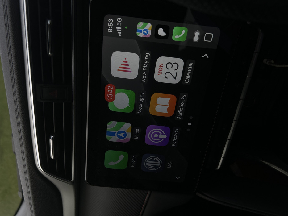 The image depicts the interior of a vehicle located in Russell Vale, Australia, specifically focusing on the dashboard and central infotainment system. The upper dashboard features a dark, possibly leather-like material with visible stitching and a chrome-colored trim line. Below this, two horizontal air vents with chrome accents are visible, separated by a red triangular hazard warning button. The central element is an illuminated infotainment screen displaying the Apple CarPlay interface. This interface shows a grid of application icons, including "Phone," "Maps," "Messages" (with a "1342" notification badge), "Now Playing," "MG," "Podcasts," "Audiobooks," and "Calendar" (displaying "MON 23"). The upper right corner of the screen indicates the time as "8:53" and "5G" network connectivity with full signal strength. A vertical sidebar on the right edge of the screen displays additional smaller icons. Below the screen, partially visible, a white cable extends from the vehicle's console. The ambient lighting suggests daytime conditions. No individuals are visible in the frame.