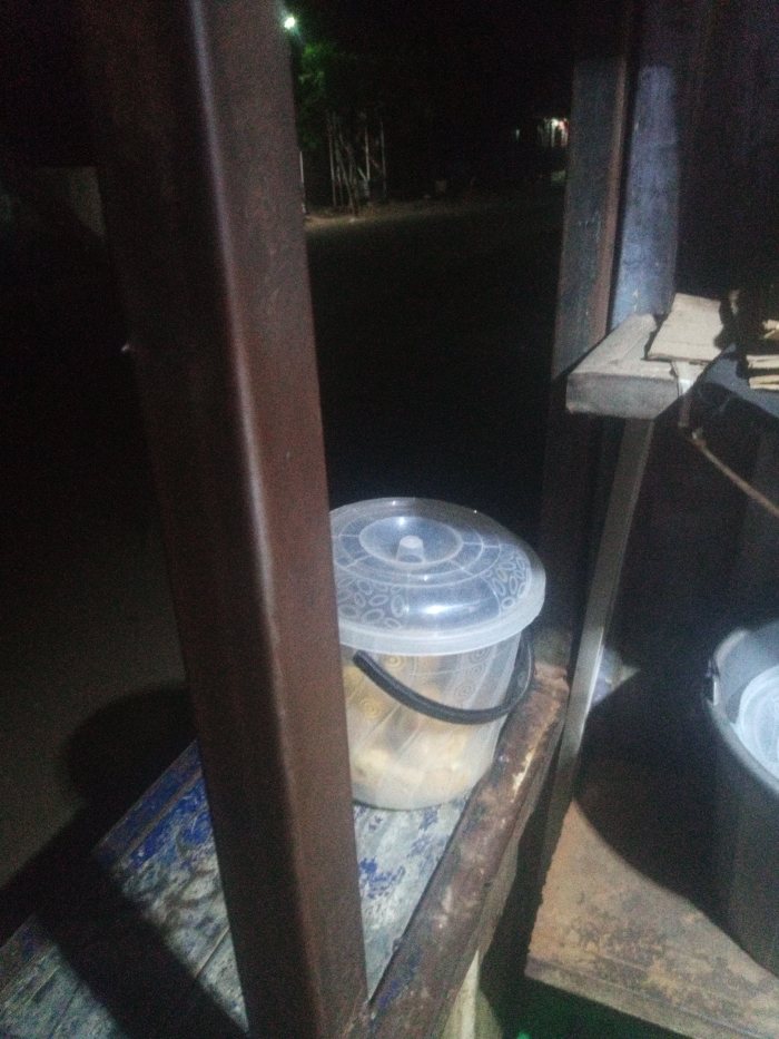 The image depicts a nighttime scene in Maiburiji, Nigeria, characterized by low light and artificial illumination in the background. In the immediate foreground, a weathered, multi-colored (blue, white, and brown) surface, possibly a wooden plank or table, is visible. Resting on this surface is a transparent plastic bucket with a clear, patterned lid and a black handle. The bucket contains light-colored, irregularly shaped contents. To the right, partially visible, is another similar clear plastic container with a lid, and above it, several small, light-colored rectangular pieces of material (possibly cardboard or thin wood) are stacked on a wooden shelf. Vertical and horizontal rusty metal supports frame the central objects, suggesting a makeshift stand or structure. The background is predominantly dark, featuring a faint, unpaved path or road receding into the distance. A bright green light source is visible in the upper left background, illuminating some vertical structures or tree branches. No individuals, actions, or interactions are discernible in the scene.
