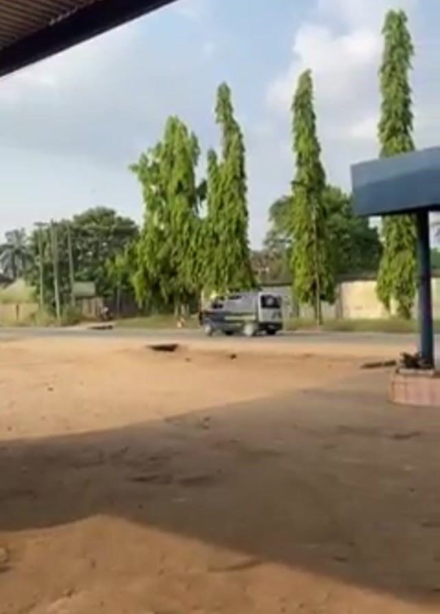 The scene is filmed from under a corrugated metal awning, offering a view of a dusty, sandy area that leads to a paved road. On the road, pedestrians and a grey van are visible. Tall, slender trees line the roadside. The view is framed by a gas station pump with the "PILLARS ENERGY" logo.