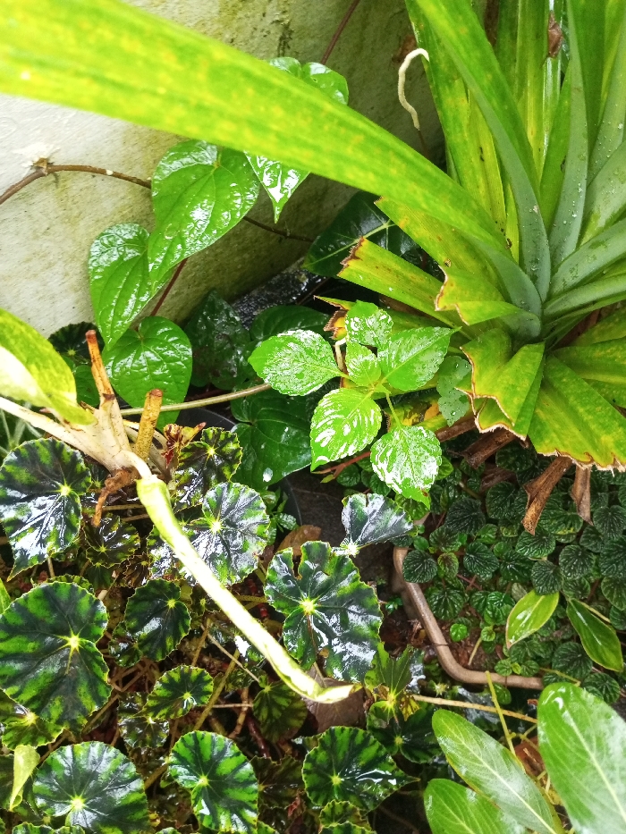 A vibrant, green garden scene bursts with diverse foliage. Large, striped leaves arch across the top, contrasting with rounded, heart-shaped leaves climbing a wall. Beneath, patterned, disc-like leaves mingle with small, compact greenery and a central plant with bright, oval leaves. A pale stem extends through the dense vegetation. Raindrops glisten on the leaves, creating a fresh, glistening effect.