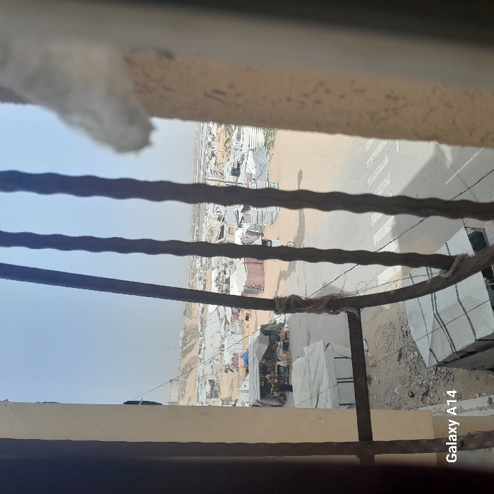 The image presents an elevated view of a sprawling informal settlement within the city of Khan Yunis, Palestinian Territory, under a light blue, hazy sky. In the immediate foreground, three dark, twisted vertical elements, consistent with rusty rebar or thick ropes, hang centrally, partially obscuring the scene. A lighter-colored structural element frames the left side of the view. In the midground, a paved road with white crosswalk markings traverses sandy ground. To the road's left, a makeshift market stall is visible, attended by two indistinct human figures. Several white tarp-covered shelters are positioned to the left and below the viewing point. The background consists of a vast, densely packed area of makeshift shelters constructed from various materials, including tarpaulins and corrugated metal, extending across predominantly sandy terrain. Distant sandy hills are discernible along the horizon. The bottom-left corner features a "Galaxy A14" watermark.