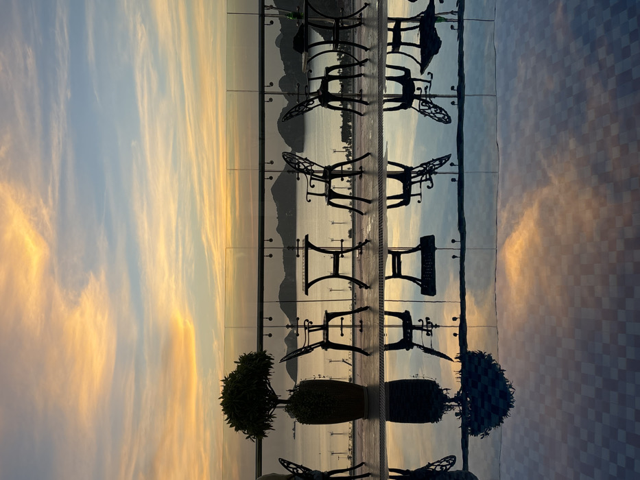 This image depicts a rooftop infinity pool and patio area at sunset, overlooking a bay characterized by distinctive karst limestone islands. The location is consistent with Lan Ha Bay, part of the Cat Ba Archipelago, Hải Phòng, Vietnam. The upper portion of the frame shows a sunset sky with horizontal layers of orange, yellow, and light blue clouds. Below this, a series of dark, irregular limestone islands rise from the calm waters of the bay. A clear glass safety barrier with dark vertical posts runs horizontally across the midground, separating the patio from the bay vista. On the patio, which appears wet, multiple objects are silhouetted against the sky. From left to right: a tall potted plant/small tree, a partially visible ornamental metal chair, a small circular table, another ornamental metal chair, a second small circular table, two additional ornamental metal chairs, and a partially visible third table with a dark, vertical object resembling a hookah. The lower half of the image is occupied by the infinity pool, which has a visible light-colored checkered tile pattern at its bottom. The pool's surface acts as a mirror, reflecting the sunset sky, the glass barrier, and the silhouetted forms of the patio furniture and plant. No individuals are present in the scene.