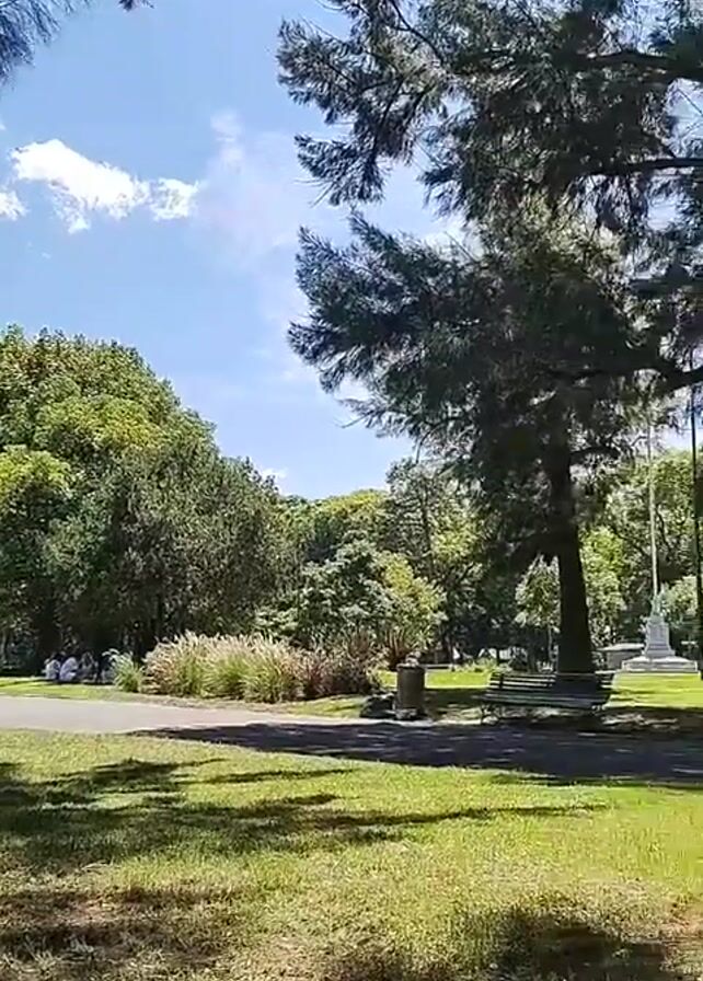 park on a sunny day. There are many trees that provide shade on the grass. A paved path winds through the park. A bench sits in front of a tall white monument, likely a war memorial, which is visible in the distance. There are a couple of people sitting near the path in the background. There are also several trash cans placed around the park.