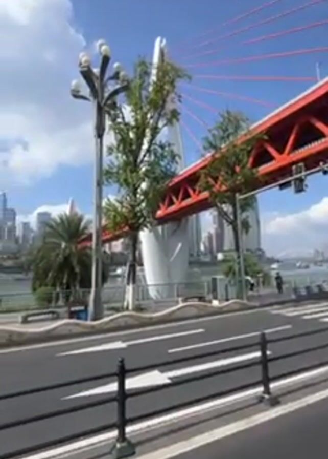 The video begins with a shot of the city of Chongqing, China. An orange-red bridge stands against the backdrop of a clear sky and a river lined with skyscrapers. The camera is positioned inside a moving vehicle, showing the road, street lamps, and some pedestrians. The video then cuts to a blonde woman inside the same vehicle. She is looking directly at the camera.