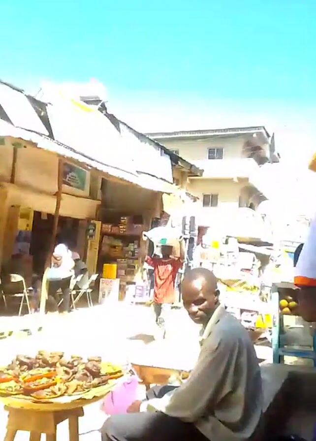 The video depicts an outdoor market scene, possibly in an African or similar developing country setting, under a bright, clear sky