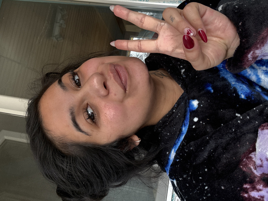 A single female subject is depicted in a close-up portrait, oriented slightly to her right, looking towards the viewer. Her dark hair is styled back from her face. She has light brown skin, with visible reddish patches on her cheeks, and wears long false eyelashes and light-colored lipstick. A small, silver-colored hoop earring is present in her left ear, and a tattoo resembling script is visible on the left side of her neck. She wears a black, plush hooded garment with a "galaxy" pattern featuring blue, purple, and white abstract shapes. Her left hand is raised, displaying a peace sign with the index and middle fingers extended. The fingernails are almond-shaped and painted dark red, with the ring finger nail featuring a clear base with a white heart design. A small tattoo, possibly letters, is visible on the back of her left hand. The background is out of focus, showing a blurred indoor or semi-sheltered area with a window or glass panel behind her, reflecting ambient light and indistinct shapes. The scene is located in the city of Kastel, Bulgaria.