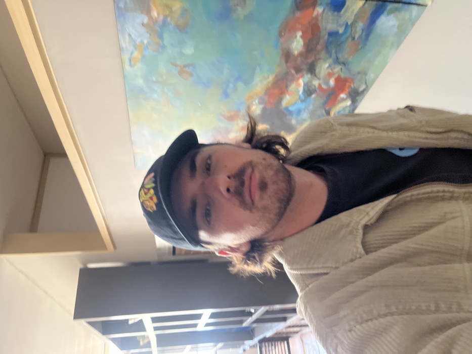 A selfie of a fair-skinned male with shoulder-length brown hair and a beard, wearing a black baseball cap and a tan corduroy jacket over a dark shirt. He's looking directly at the camera. An abstract painting in blues, reds, and yellows hangs on the wall behind him. The background also includes a room under construction with visible framing and a dark gray structure.