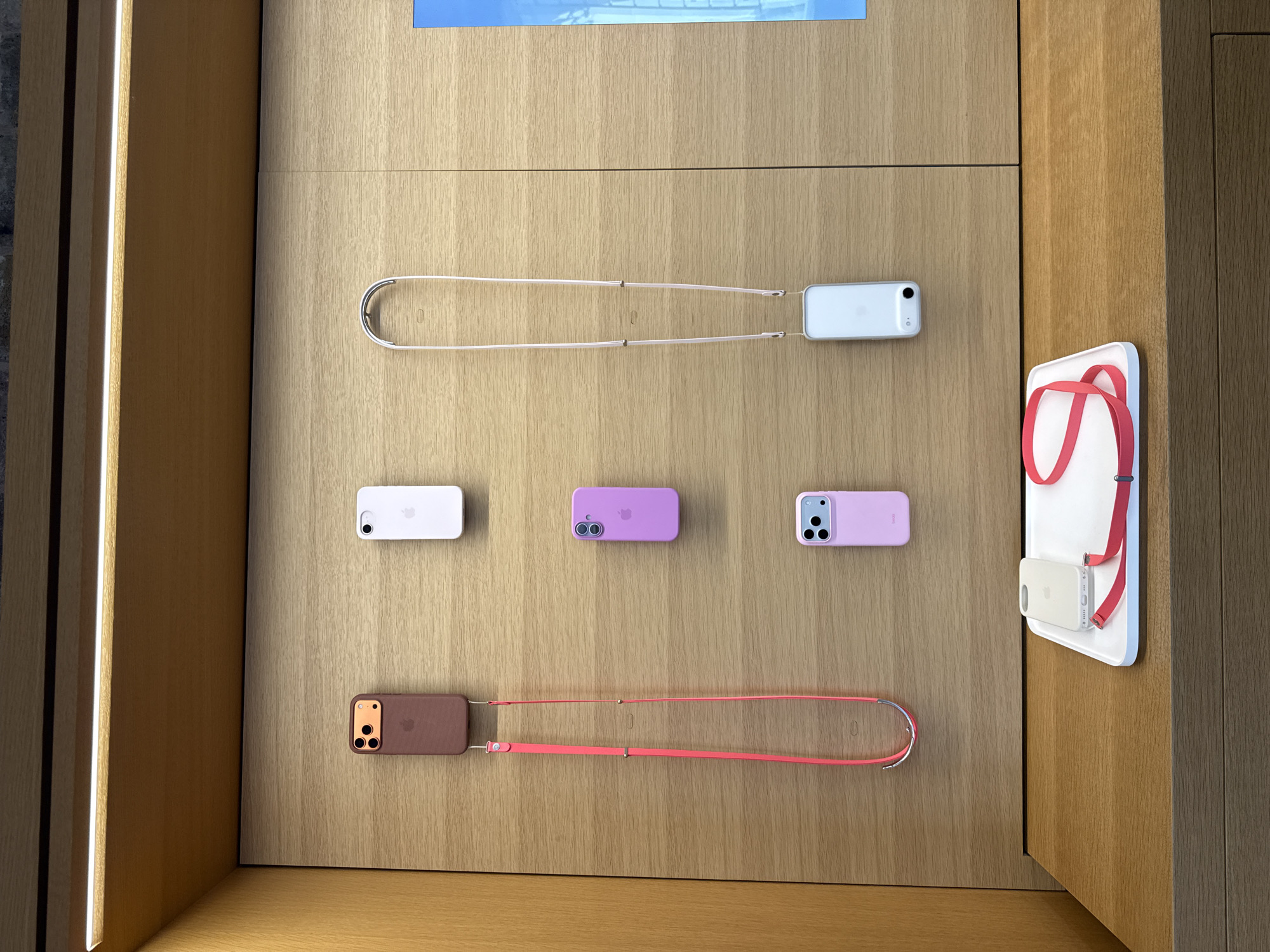 This image depicts an interior retail display within an Apple Store, located in the City of London, United Kingdom. The environment is characterized by light-toned wooden paneling on the walls and a matching wooden counter surface in the foreground. A linear LED light fixture runs across the top of the display area. Mounted vertically on the wooden wall are several iPhone devices, primarily fitted with cases. On the upper left, a brown-cased iPhone with an Apple logo is presented, featuring an attached neon pink lanyard with silver accents, hanging downwards. To its immediate right, a white iPhone, unencased and displaying its Apple logo, is also mounted vertically. In the middle row, a purple-cased iPhone with an Apple logo is displayed. Adjacent to it, a white-cased iPhone with an Apple logo is shown with a white lanyard, featuring silver accents, hanging in a U-shape. On the lower left, a light pink-cased iPhone, bearing an Apple logo and faint "CASETiFY" branding, is mounted vertically. On the wooden counter directly below the wall display, a white rectangular tray holds an off-white iPhone case with an Apple logo, positioned horizontally. A neon pink lanyard, identical to the one on the brown-cased iPhone, is coiled on the tray next to the case. A partial blue rectangular graphic or screen is visible on the far right edge of the frame. No individuals are present in the scene.