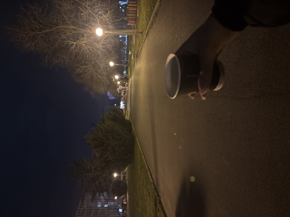 The image captures an outdoor nighttime scene in the city of Unknown, Unknown, looking down a paved pathway. In the foreground, a human hand holds a dark, disposable cup with a white rim and base, containing a light-colored liquid. The asphalt pathway extends into the distance, bordered by green grass on both sides. Multiple globe-shaped streetlights illuminate the path. On the left, evergreen bushes and trees are visible, with a multi-story building in the background. On the right, bare deciduous trees line the path, along with a park bench and a section of a colorful playground structure featuring red, yellow, and blue elements. Further down the path, indistinct figures of people are visible under additional streetlights, beneath a dark night sky.