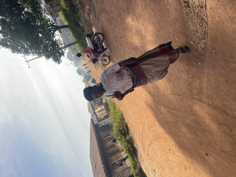 An individual is captured on a dirt road. The person is adorned in a white top and a patterned wrap. A building runs parallel to the road on the left. To the left of the individual, a motorbike is visible with another person seated. The scene is brightly lit with a clear sky overhead. Foliage and trees can be seen in the background and along the roadside.