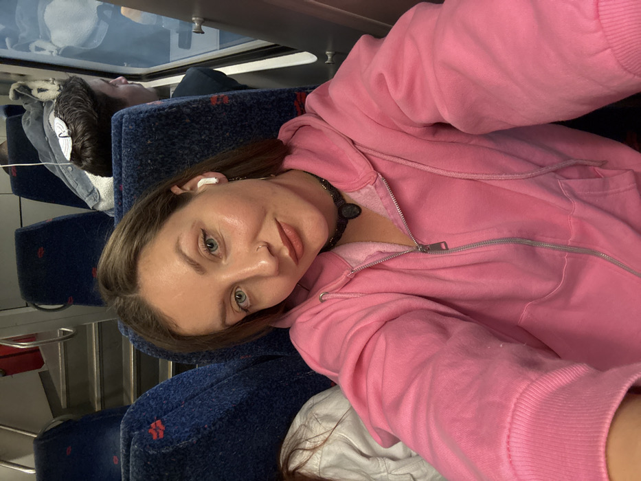 A young woman in a pink zip-up hoodie poses in a train seat