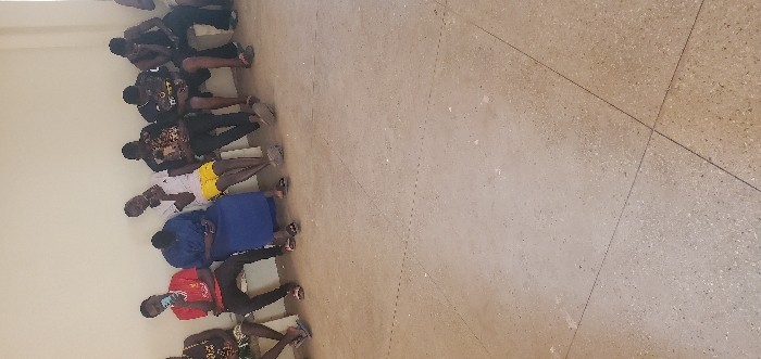 In Minna, Nigeria, a group of eight young adult males is depicted seated on a light-colored, low bench or ledge against a plain, off-white wall