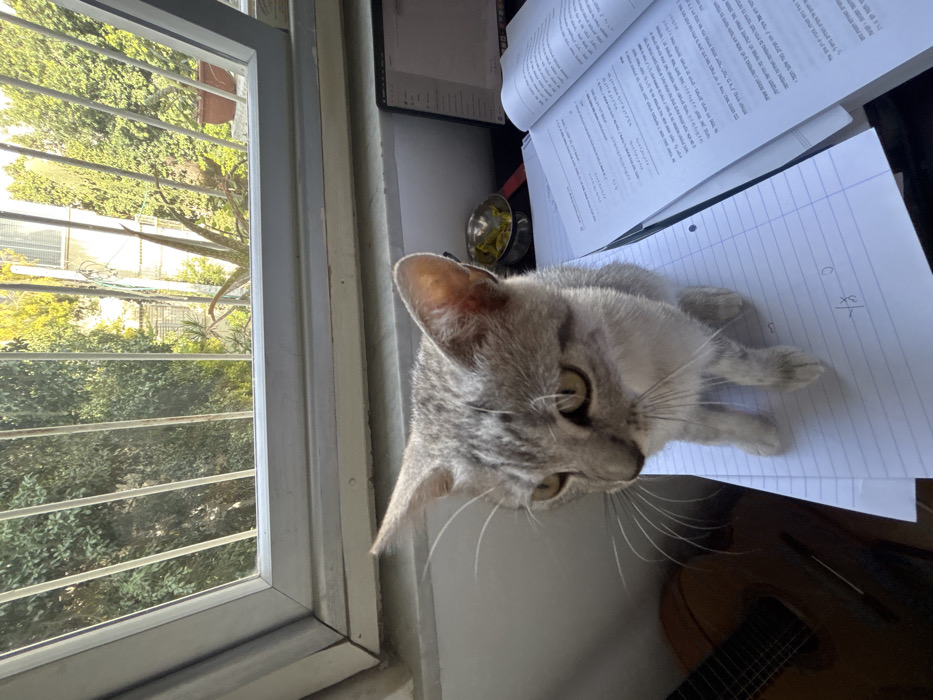 The image depicts an indoor scene in Tel Aviv, Israel, focusing on a domestic short-haired tabby cat. The cat, with grey fur and subtle darker markings, is positioned centrally in the foreground, sitting on an open, lined notebook that contains handwritten algebraic or mathematical notations. To the right of the cat, an open textbook displays text printed in Hebrew, indicating the local language. Further right, a dark electronic device, likely a laptop or tablet, is visible with its screen illuminated. Behind the textbook, a small metallic bowl holds several yellow-green objects. In the lower-left corner, a portion of an acoustic guitar is partially visible. The background features a multi-paneled window, secured with vertical metal bars, looking out onto an outdoor environment. This includes dense green foliage from trees and shrubs, portions of residential buildings, and an aloe vera plant in a terracotta pot, all illuminated by natural daylight.
