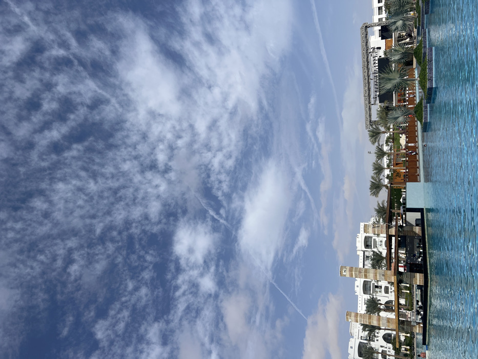 A daytime scene features a clear blue sky with streaky clouds. A contrail is faintly visible. The bottom right showcases a bright blue swimming pool adjacent to a white building complex. Palm trees line the pool area and separate the complex from the pool. The building has a combination of light and dark brown construction accents.